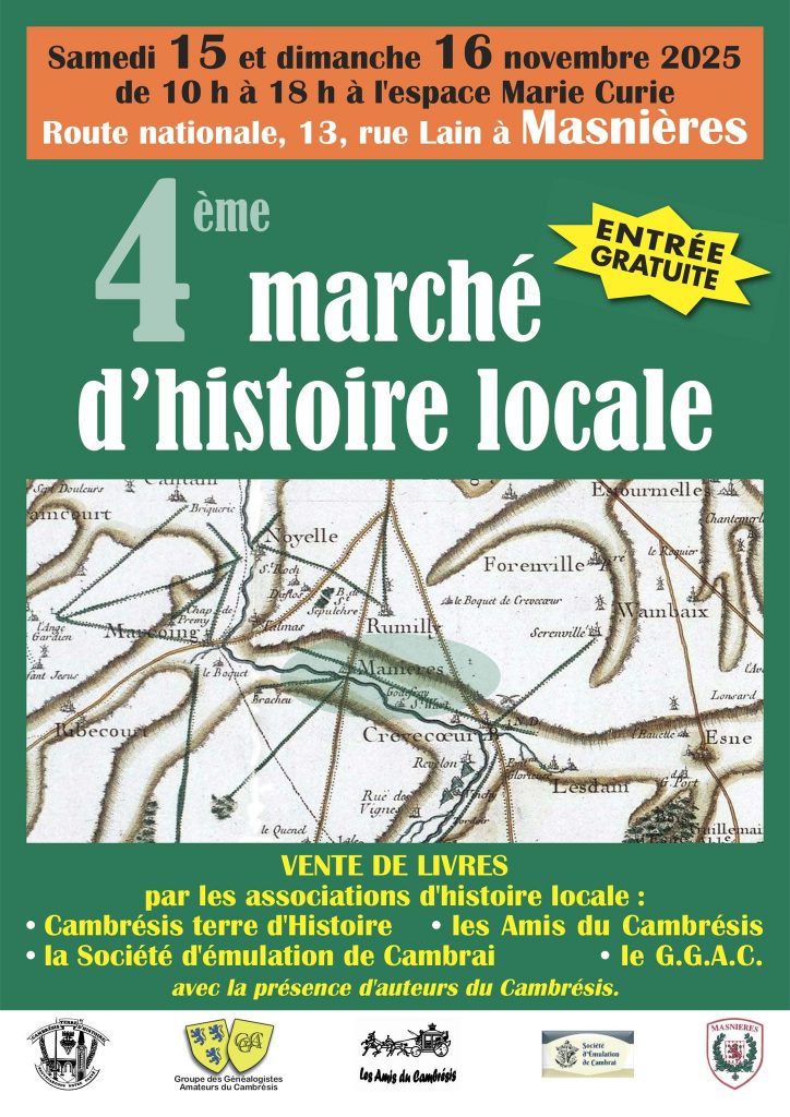 Nous avons le plaisir de vous annoncer que le 4è marché d’histoire locale aura lieu les samedis 15 et dimanche 16 novembre de 10 h à 18 H à l’Espace Marie Curie de Masnières. Aux côtés de l’association « Cambrésis Terre d’Histoire« . Seront présents nos amis de la Société d’Emulation de Cambrai, des Amis du Cambrésis et du Groupe des Généalogistes Amateurs du Cambrésis ainsi que plusieurs auteurs d’ouvrages histoire locale.