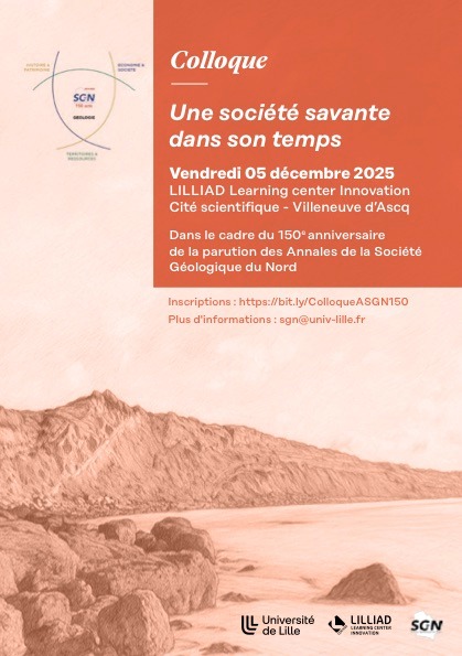 Dans le cadre du 150e anniversaire de la parution des Annales de la Société Géologique du Nord (ASGN), la SGN organise le vendredi 5 décembre 2025 au LILLIAD Learning center Innovation (Cité scientifique – Villeneuve d’Ascq) un colloque intitulé « Une société savante dans son temps ».