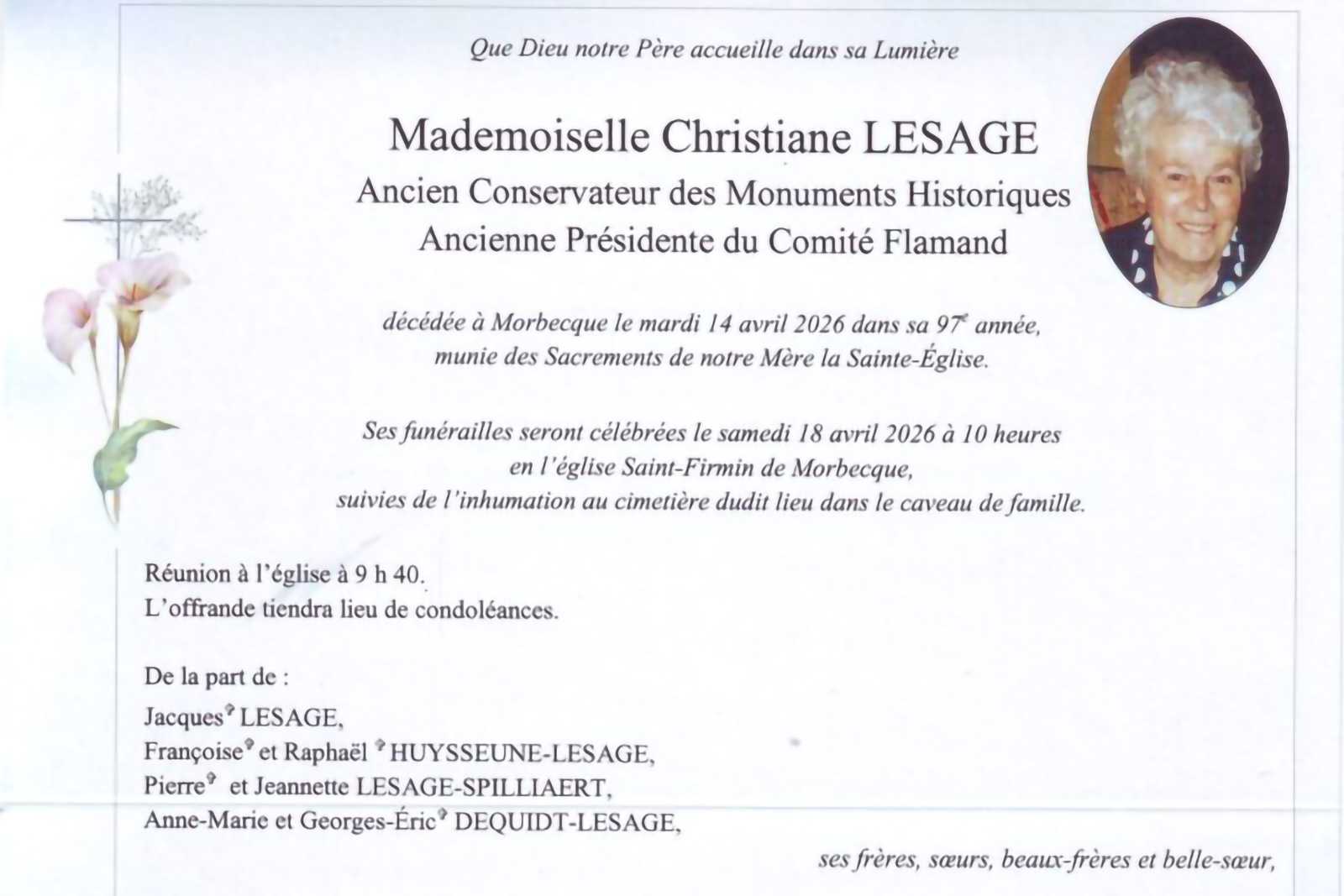 Christiane Lesage, présidente honoraire du Comité flamand de France, est décédée mardi soir. Ses obsèques seront célébrées le samedi 18 avril à 10h à l’église de Morbecque.